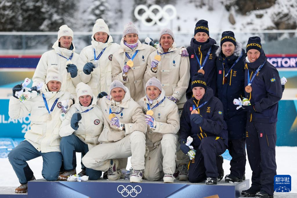 2月17日,冠军法国队(中)、亚军挪威队(左)、季军瑞典队在颁奖仪式上合影。