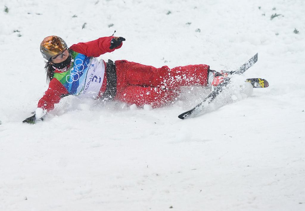 落地时,她重重摔在雪地上