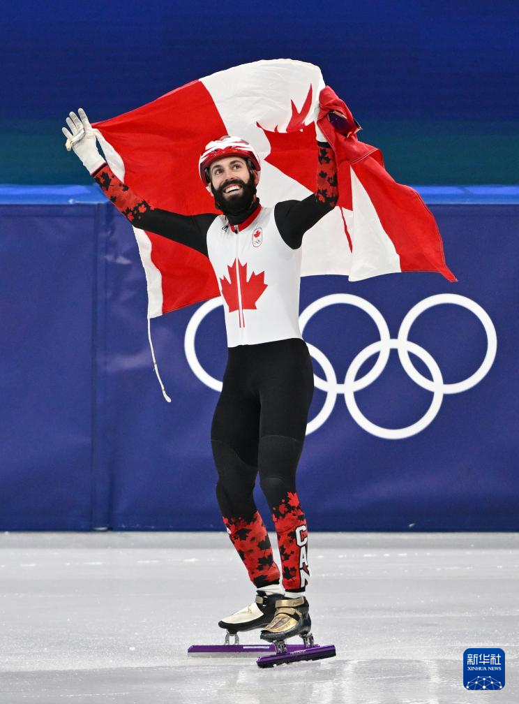 2月18日,加拿大队选手史蒂文·杜博伊斯在比赛中率先冲线后庆祝。