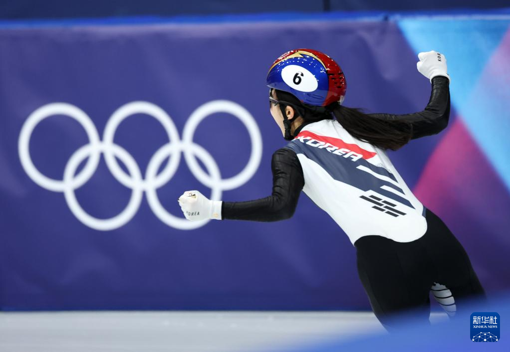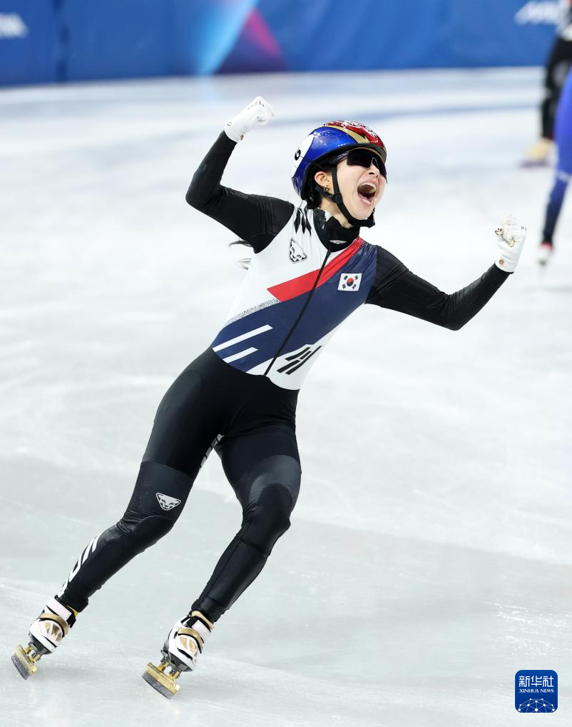 2月18日,韩国队选手金吉莉率先冲线后庆祝。