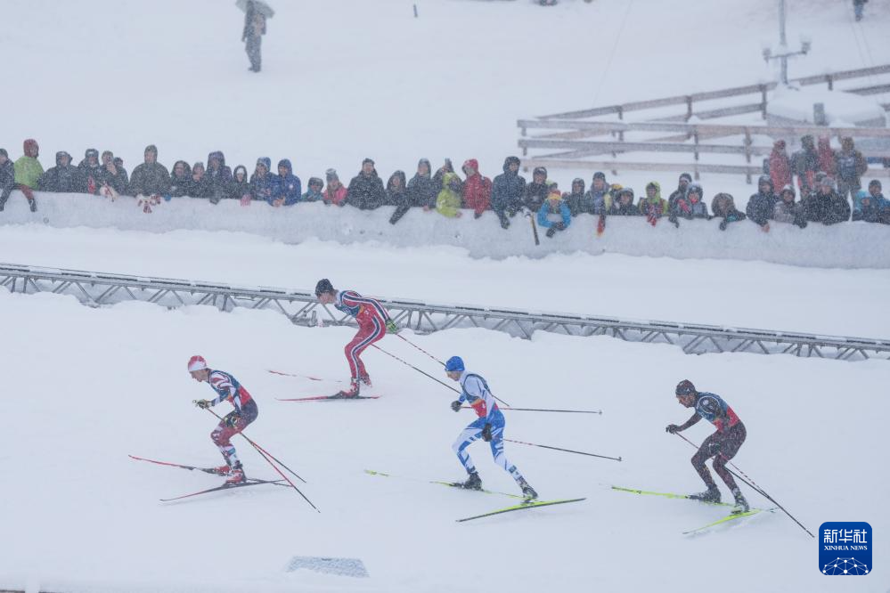 2月19日,挪威队选手奥夫特布罗(左)与芬兰选手希尔沃宁在比赛中即将冲线。