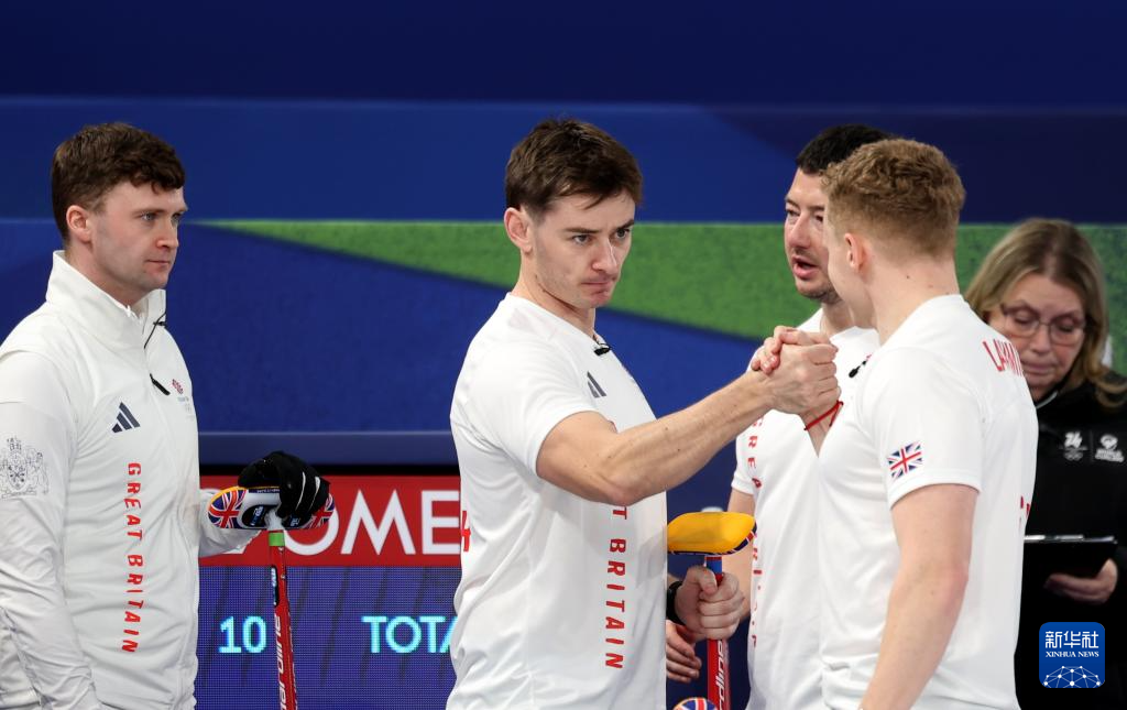 2月18日,英国队选手在比赛后庆祝胜利。英国队9比2战胜美国队。
