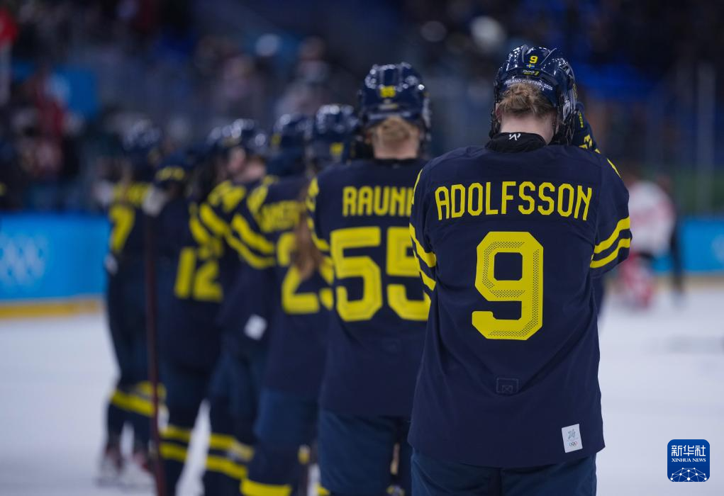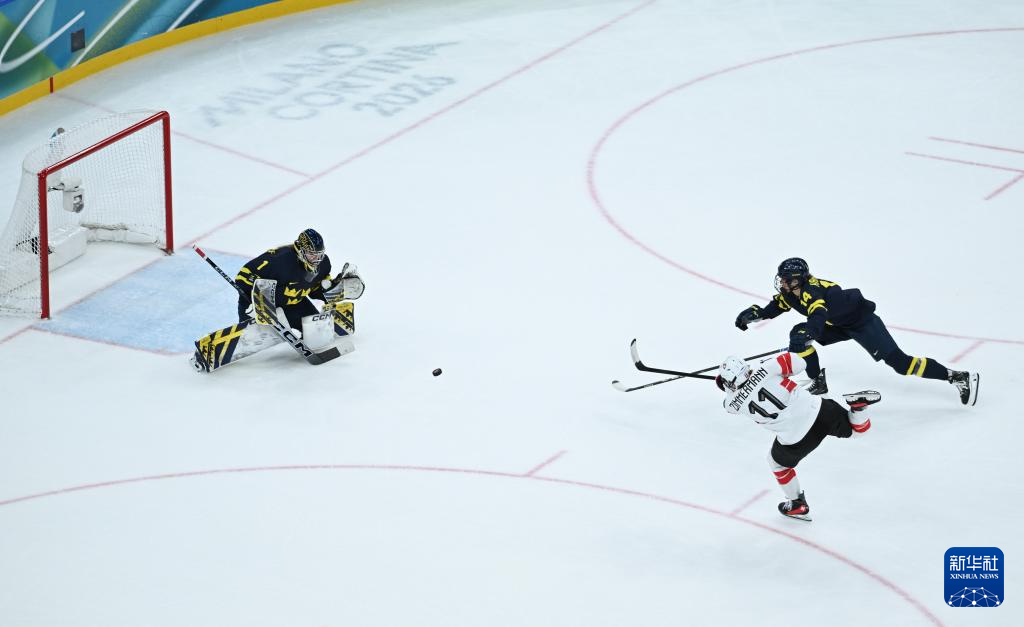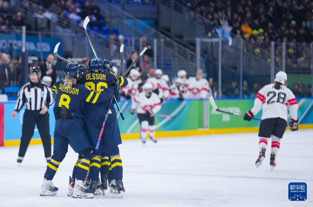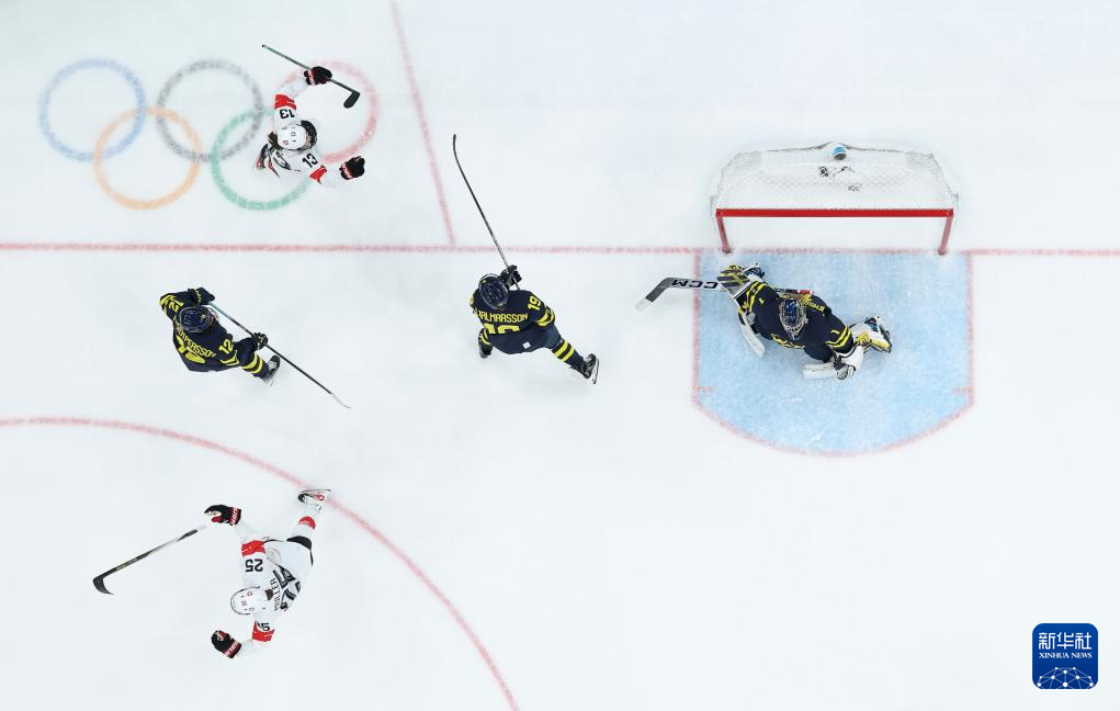 2月19日,瑞典队球员在比赛中庆祝进球。