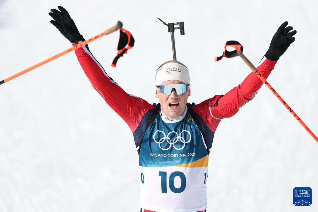 2月20日,挪威选手约翰内斯·戴尔冲线后庆祝。他获得冠军。