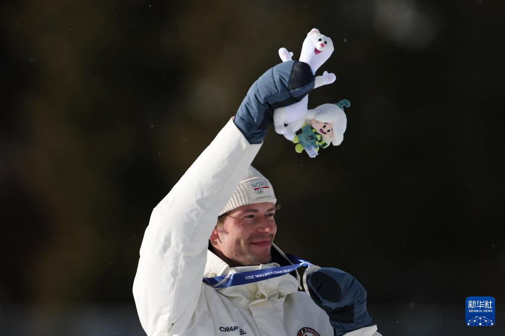 2月20日,亚军挪威选手斯图拉·霍尔姆·莱格雷德在颁奖仪式上庆祝。