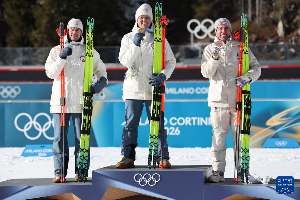 2月20日,亚军挪威选手斯图拉·霍尔姆·莱格雷德、冠军挪威选手约翰内斯·戴尔、季军法国选手康坦·菲永·马耶(从左至右)在颁奖仪式上合影。
