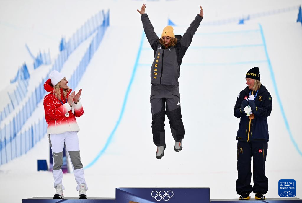 2月20日,冠军德国选手达妮埃拉·迈尔(中)、亚军瑞士选手范妮·史密斯(左)、季军瑞典选手桑德拉·内斯隆德在颁奖仪式上合影。
