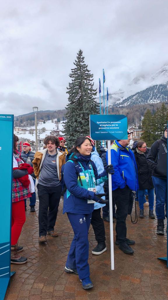 ↑在科尔蒂纳冰壶馆前的引导志愿者钟昕