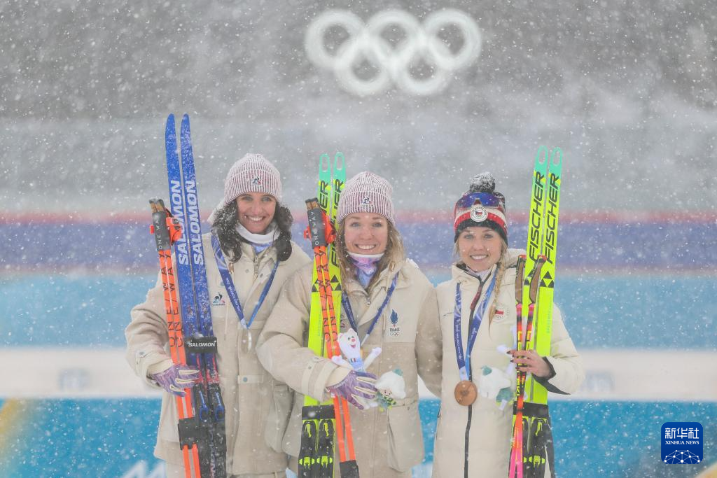 2月21日,冠军法国选手米舍隆(中)、亚军法国选手西蒙(中)和季军捷克选手沃博尔尼科娃在颁奖仪式上合影。