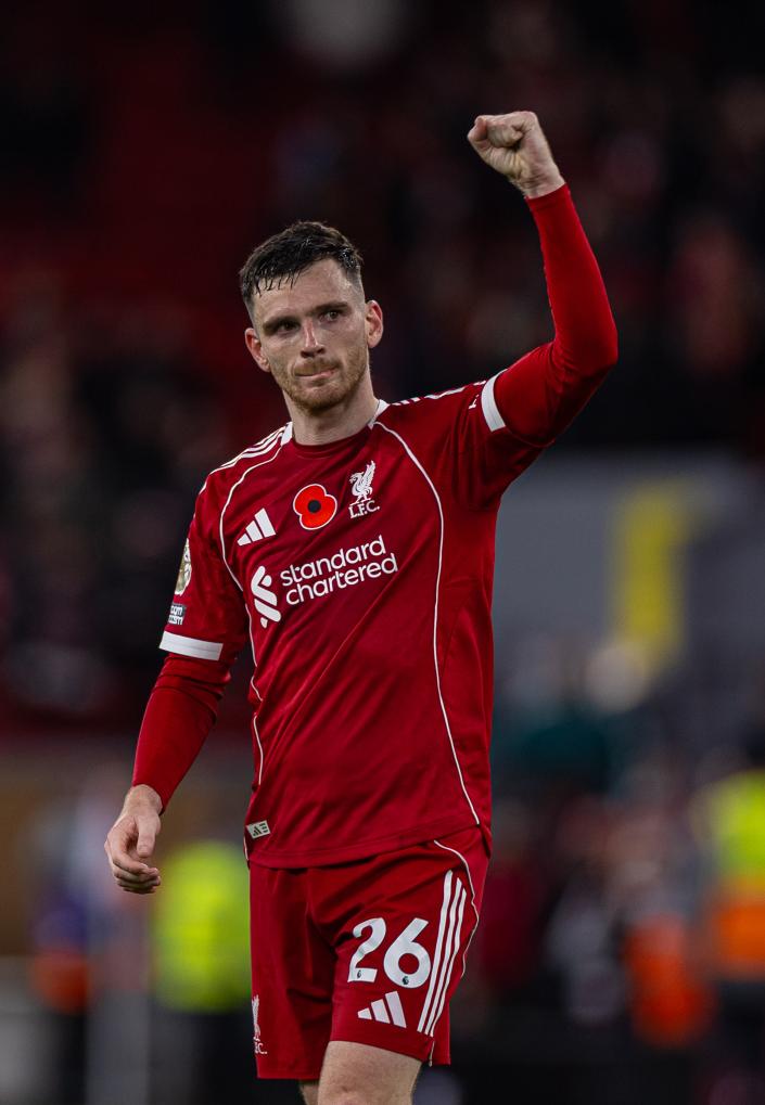 2025年11月1日,在2025-2026赛季英格兰足球超级联赛第十轮比赛中,利物浦队主场2比0战胜阿斯顿维拉队。图为利物浦队球员罗伯逊赛后庆祝胜利。新华社发