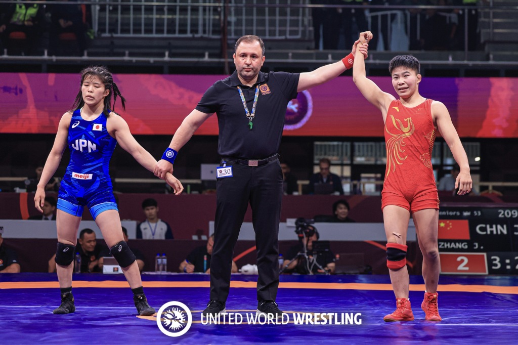 张金(右)在女子自由式摔跤53公斤级半决赛中战胜日本选手青冈萌。(图片来自世界摔跤联合会官网)
