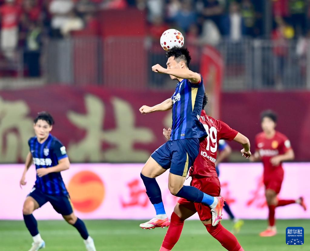 4月11日,武汉三镇队球员贺惯(上)在比赛中争顶头球。