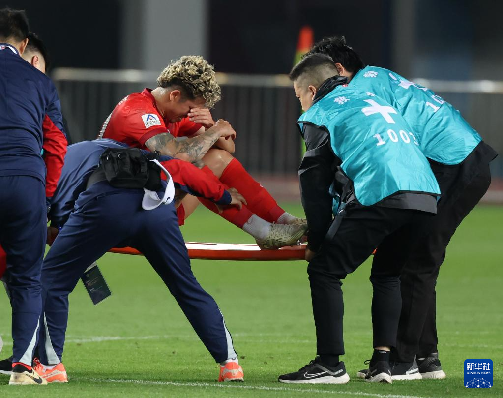 4月11日,河南俱乐部彩陶坊队球员纳萨里奥(中)在比赛中受伤离场。