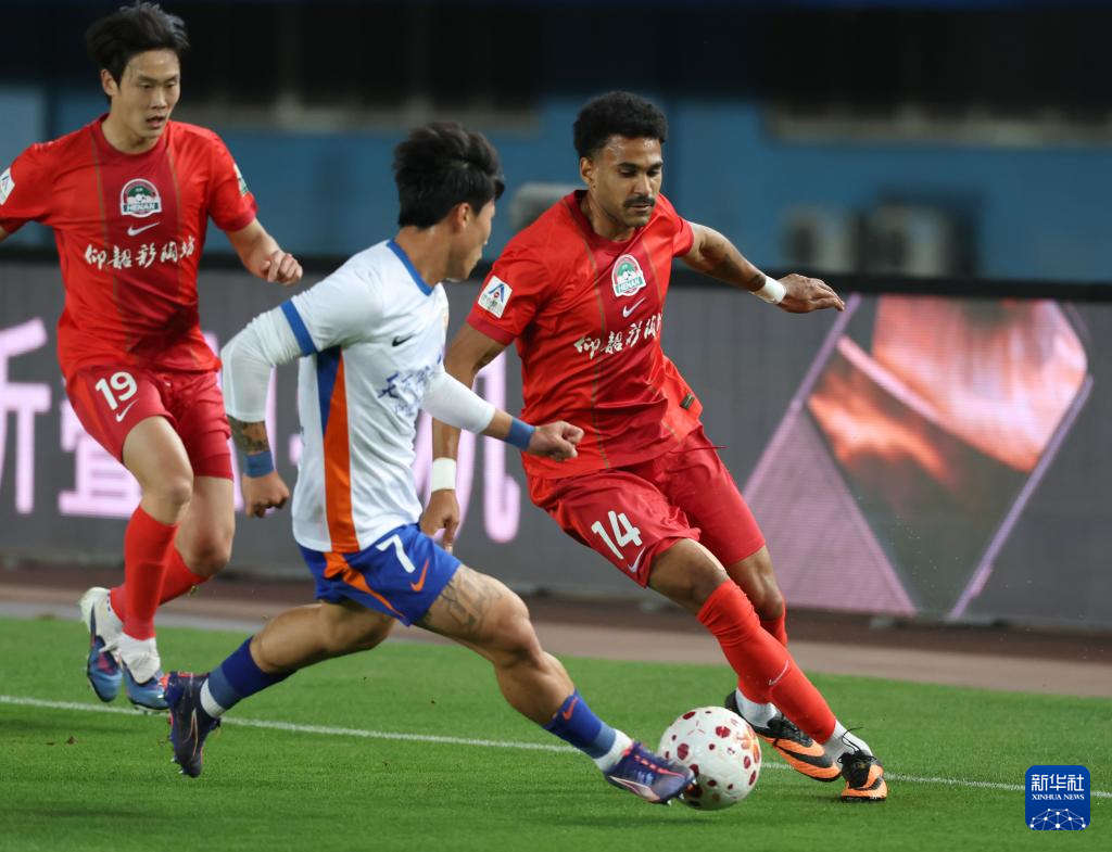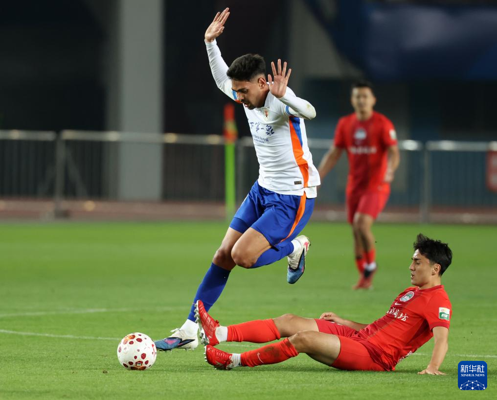 4月11日,山东泰山队球员泽卡(前右)与河南俱乐部彩陶坊队球员卢卡斯·马亚(前左)在比赛中拼抢。