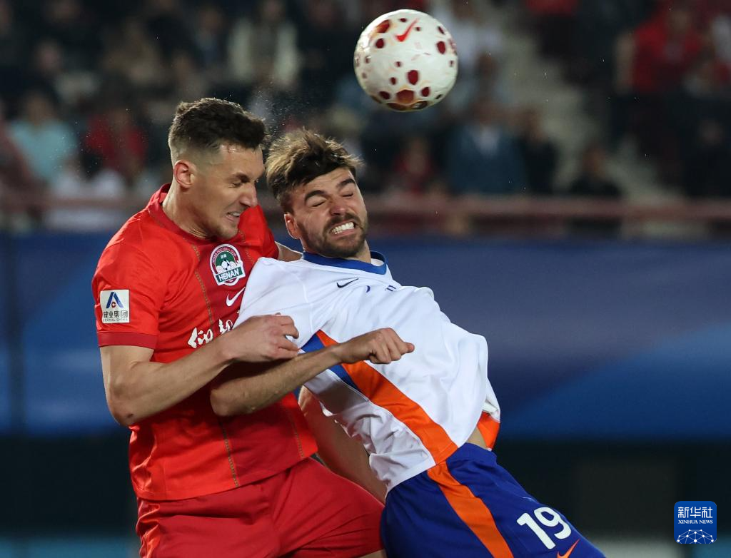 4月11日,山东泰山队球员泽卡(右)与河南俱乐部彩陶坊队球员卢卡斯·马亚在比赛中争顶。