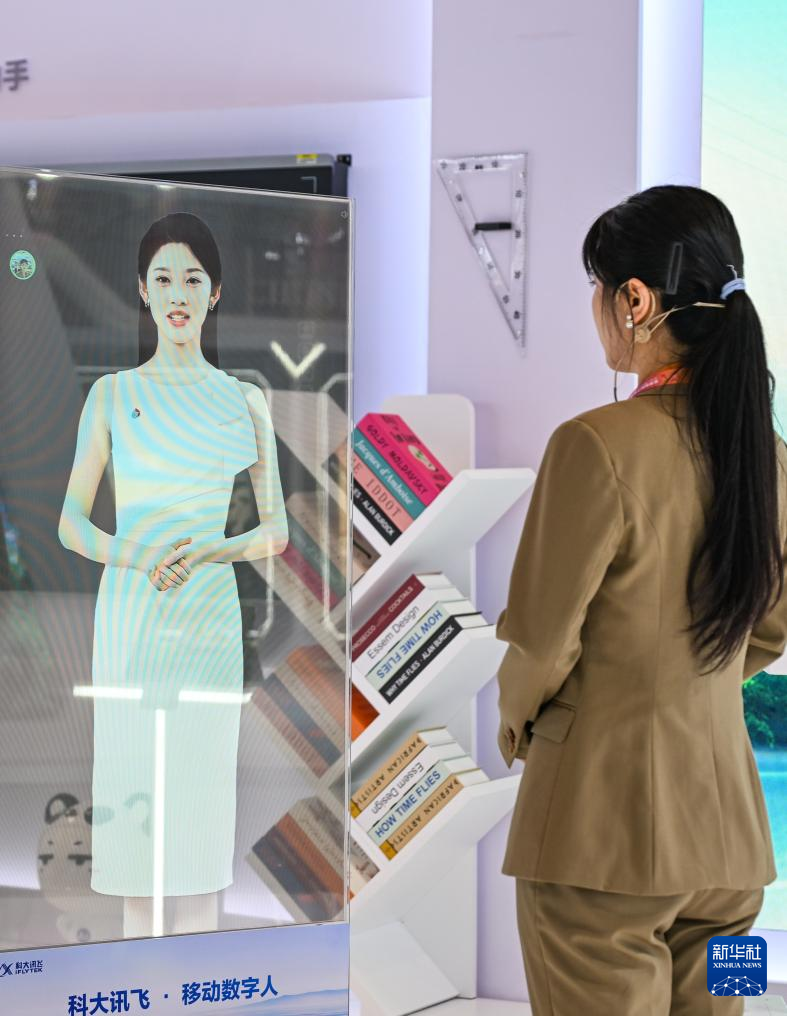 9月4日,工作人员在2025世界智能产业博览会科大讯飞展厅与移动数字人互动。