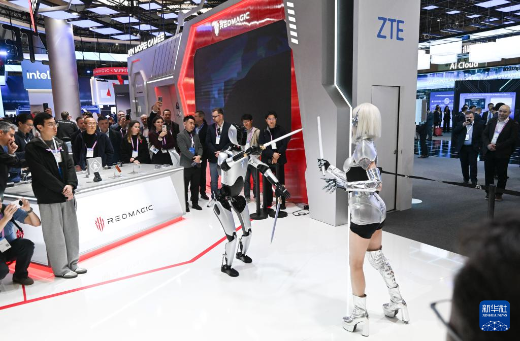 3月2日,在西班牙巴塞罗那,人们在中兴通讯展台观看机器人与真人“对打”。