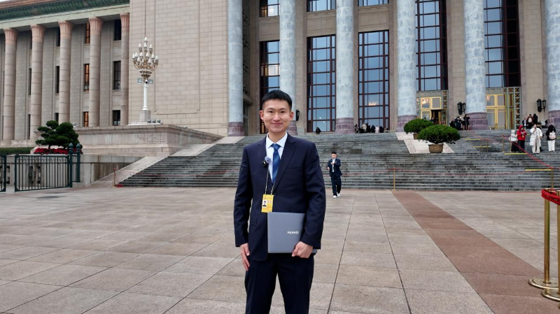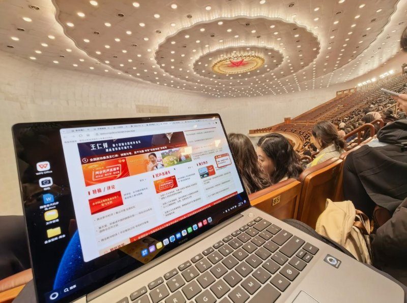 3月5日,采访两会的记者携鸿蒙电脑在人民大会堂东门外
