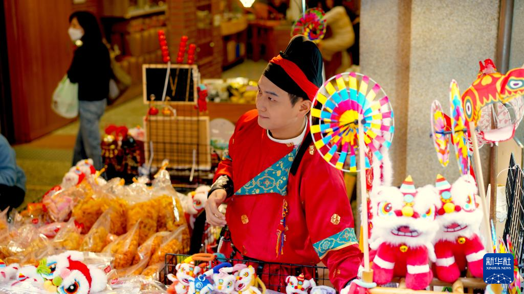 百年骑楼下,台湾青年吴旻义身着红底缀蓝纹的传统服饰,头戴束着朱红抹额的黑幞头,不断向往来人群推销年货。摊档上,写有“马到成功”“马上发财”等祝福语的红包整齐摆放,红狮玩偶憨态可掬,传递着新春的喜气与好运。