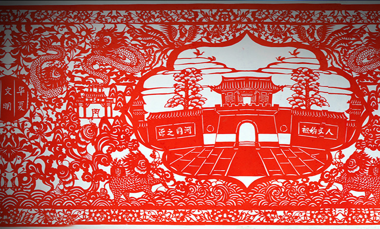 于是我決定回家專門剪紙,但是我父母認為鉸花都是老婆婆們閑著沒事做的事,你一個男孩子還是應該好好賺錢。就這樣我跟父母僵持了很久,但最后還是我拗著性子從外邊回到了我們農(nóng)村老家,開始尋找會剪紙的老人,去記錄、去詢問、學習我們地區(qū)傳統(tǒng)的剪紙民俗知識。因為現(xiàn)在像剪紙這個藝術(shù),在我們的地區(qū)還僅是一些老人出自一些喜好去剪、去做,但隨著這些老人的去世,這些作品也就會隨著一把火被燒掉。我希望我能把這些東西都保留下來,我希望有更多的人去了解我們地區(qū)的剪紙文化,所以我就下決心收集這些剪紙的資料,去申報非物質(zhì)文化遺產(chǎn)名錄。想要申報還要去做很多的事情,一是去尋找這些傳世的老作品,另外就是要擴大孟津剪紙的影響力,參加各種比賽去獲獎。那時我白天去尋找老藝人,晚上就自己在屋里埋頭創(chuàng)作,每天晚上都會剪到凌晨一點多。我媽本來是反對的,但是當她看到每晚我都會剪到很晚,她就明白了我是真心喜歡這個事兒,就慢慢地開始心疼我。后來她也幫助我開始粘貼,像我剪的《都說我孟津好風光》,這個作品長13米,沒有那么長的紙,我們就一起粘貼?;巳齻€多月剪完,家里邊沒有那么大粘貼裝裱的空間,我父母就站在我們家院子的平房頂上一起把它鋪開,一個一個地粘起來裱好。
