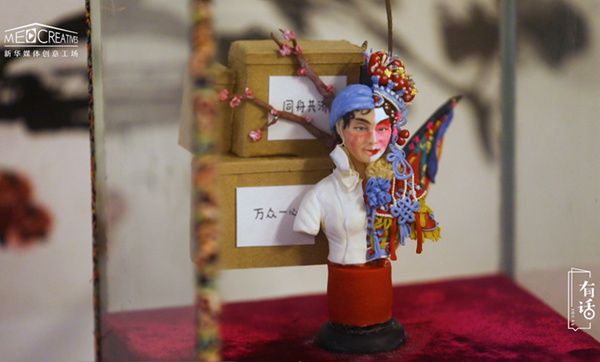 面塑俗稱面人,因?yàn)樗饕念}材都是人物,所以老百姓們也管它叫面人。這個(gè)是“三八婦女節(jié)”那天做的,我看到當(dāng)時(shí)有很多的醫(yī)護(hù)人員作為人類的代表跟另外一個(gè)物種去斗爭(zhēng)、保護(hù)我們,覺得她們還真的是很了不起的。想到以前巾幗英雄里邊穆桂英這個(gè)角色,加上京劇也是我們傳統(tǒng)文化中很寶貴的一個(gè)部分,就把這兩個(gè)結(jié)合在一起做了一個(gè)拼臉。