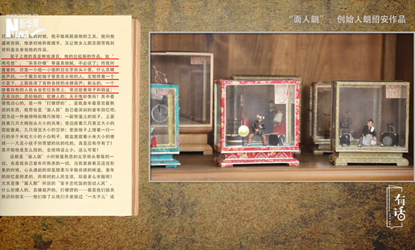 冰心先生的《小桔燈》散文集中,有一篇叫作《“面人郎”訪問記》的文章:“架子上擺的真是琳瑯滿目,他的比較新的作品,如“雞毛信”,“采茶撲蝶”等逼真細(xì)膩,不必說了;而我所最愛的,還是一小組一小組的舊北京街頭小景,什么賣糖葫蘆的,一個(gè)戴灰呢帽子穿黑色長(zhǎng)袍的人,左臂挎著一個(gè)小籃子,上面插滿了各種各樣的冰糖葫蘆;剃頭的,一個(gè)披著白布的人低頭坐在紅板凳上,旁邊放著架子和銅盆;賣茶湯的;賣砂鍋的;吹糖人的;無不惟妙惟肖!”在文章當(dāng)中,冰心先生也提到了,最令她心動(dòng)的是一個(gè)打糖鑼的,這是她童年最喜歡、最熟悉的東西,她認(rèn)為這也是“面人郎”最深刻的童年回憶。