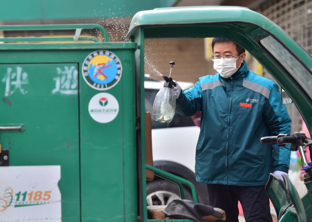 ↑1月10日,在石家莊市匯通路郵政快遞投遞部,工作人員對(duì)投遞車(chē)進(jìn)行消殺。
