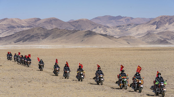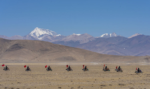 和高原的許多牧民一樣,石覺塔布是個“騎士”。從前,他騎馬放牧;現在,他騎摩托車守邊。作為昌果邊境派出所摩托車巡邏隊的隊長,這天,他要帶隊進行邊境巡防訓練。