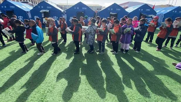 當(dāng)日,青海省果洛藏族自治州瑪多縣地震災(zāi)區(qū)中小學(xué)全面復(fù)課,來自瑪多縣民族寄宿制中學(xué)的八年級(jí)學(xué)生曲邁卓瑪與870多位同學(xué)一起,在帳篷學(xué)校迎來了復(fù)課。