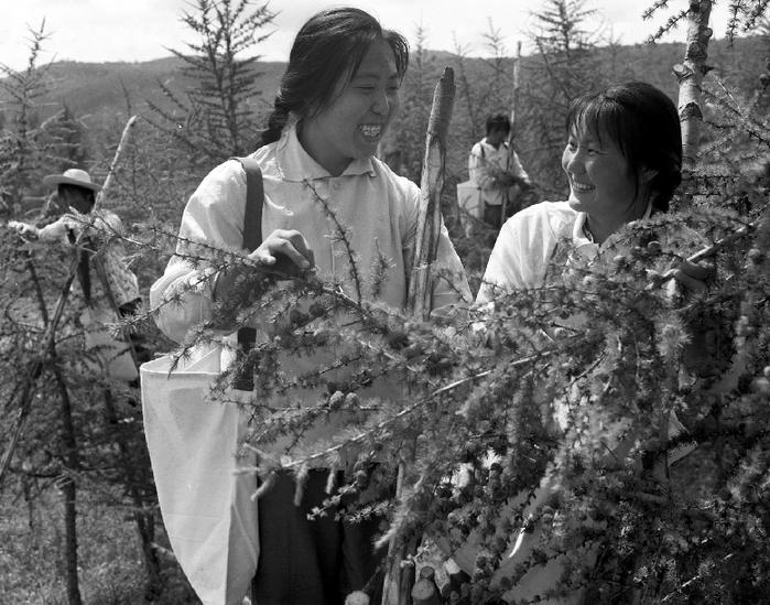??? 河北省圍場(chǎng)縣塞罕壩機(jī)械林場(chǎng)職工積極采摘松樹(shù)種,解決人工造林需要。新華社記者趙連升攝 1978年10月30日發(fā)