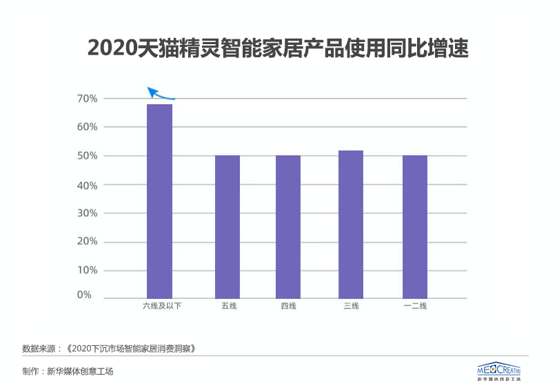 根據(jù)《2020下沉市場(chǎng)智能家居消費(fèi)洞察》顯示,50%以上的天貓精靈智能家居使用者在三到六線城市,其中六線城市用戶增速最快,四線城市銷量、銷售額增長(zhǎng)最快,下沉市場(chǎng)正在成為智能家居行業(yè)的新藍(lán)海。同時(shí),根據(jù)天貓平臺(tái)數(shù)據(jù)顯示,智能開(kāi)關(guān)、智能落地?zé)?、智能電蒸箱等價(jià)格在50元到300元之間的小家電,在下沉市場(chǎng)年銷量同比增速均超過(guò)300%,也側(cè)面佐證著這一現(xiàn)象。