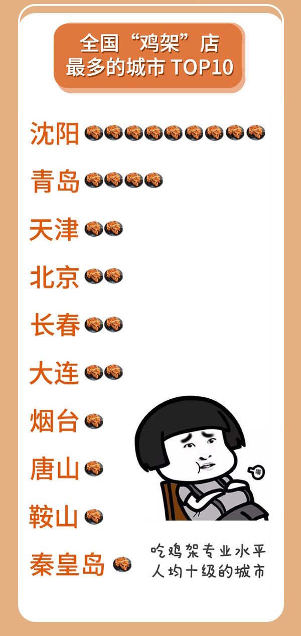 ????? 據(jù)高德地圖統(tǒng)計,全國“雞架”店最多的城市非沈陽莫屬,青島、天津、北京等城市也位于榜單前列。