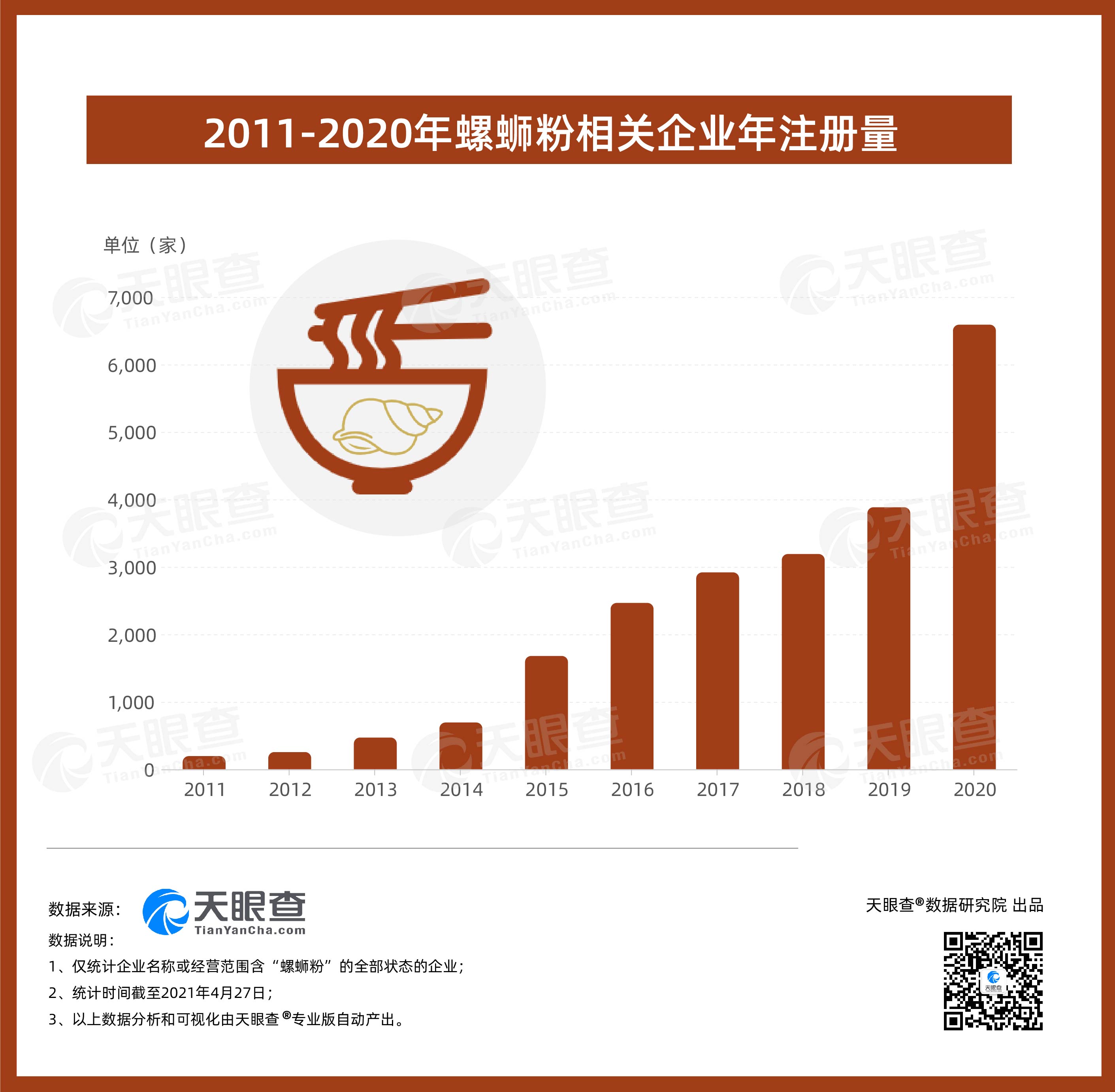 ????? 從地區(qū)分布來看,廣西的螺螄粉相關企業(yè)數(shù)量最多,超過5,300家。其中,柳州市擁有超過1100家螺螄粉相關企業(yè),占全國的6%。此外,廣東以超4,800家相關企業(yè)數(shù)量位居第二,河南和湖南也分別有超過1,000家相關企業(yè)。值得一提的是,近五年來,我國螺螄粉相關企業(yè)(全部企業(yè)狀態(tài))年注冊量整體呈現(xiàn)上漲趨勢,年增速保持在30%以上。其中,2020年新增相關企業(yè)數(shù)量最多,超過6,500家,同比增長70%。