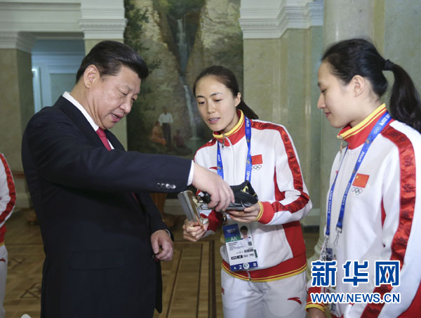??? 2月7日,中共中央總書記、國家主席、中央軍委主席習(xí)近平在俄羅斯索契親切看望參加第二十二屆冬季奧林匹克運(yùn)動(dòng)會(huì)的中國體育代表團(tuán)。這是運(yùn)動(dòng)員向習(xí)近平介紹冰雪運(yùn)動(dòng)器材。新華社記者 蘭紅光 攝