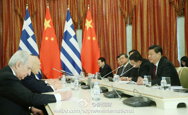 習近平7日在索契會見希臘總統(tǒng)帕普利亞斯 蘭紅光攝