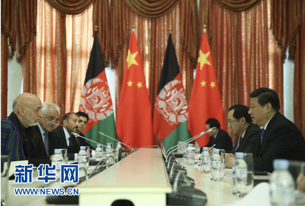 ????習(xí)近平指出,2014年之后,阿富汗的命運(yùn)將更加緊密地同地區(qū)國家聯(lián)系在一起。中方支持阿富汗融入地區(qū)經(jīng)濟(jì)合作。中方將于8月舉辦阿富汗問題伊斯坦布爾進(jìn)程第四次外長會,我們愿同阿方密切合作,辦好這次會議。中方也愿推動上海合作組織在阿富汗問題上發(fā)揮更大作用。