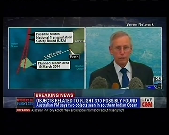 ??? 澳方稱在印度洋中發(fā)現(xiàn)了可能與馬航失聯(lián)客機有關(guān)物體這張3月20日拍攝的CNN視頻截圖顯示,澳大利亞海事安全局官員在堪培拉召開的新聞發(fā)布會上發(fā)言。澳大利亞總理阿博特當日在議會說,澳方在印度洋中發(fā)現(xiàn)了可能與馬航失聯(lián)客機有關(guān)的兩個物體。澳大利亞海事安全局官員當日說,發(fā)現(xiàn)可疑碎片的位置與之前確定的馬航失聯(lián)客機南部搜尋航道高度吻合,但當?shù)睾S蛩沫h(huán)境非常差。新華社發(fā)