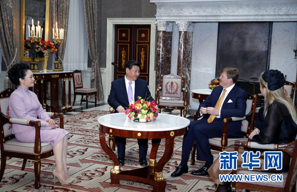 ??? 新華網(wǎng)阿姆斯特丹3月22日電(記者李斌 徐劍梅)國(guó)家主席習(xí)近平22日在阿姆斯特丹會(huì)見(jiàn)荷蘭國(guó)王威廉-亞歷山大。當(dāng)習(xí)近平和夫人彭麗媛抵達(dá)王宮時(shí),威廉-亞歷山大國(guó)王和馬克西瑪王后熱情迎接。雙方進(jìn)行了親切友好的交談。