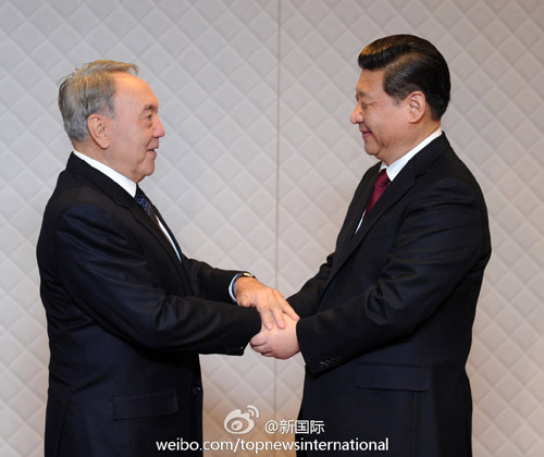 ????新華網(wǎng)北京3月24日電 據(jù)新華社“新國際”微博報道,去年金秋,習(xí)近平對哈薩克斯坦進(jìn)行國事訪問。今年年初,中哈元首在索契冬奧會開幕式親切交談。23日,兩人在荷蘭再次會晤。習(xí)近平歡迎納扎爾巴耶夫總統(tǒng)5月訪華并出席上海亞信峰會?!白鳛楹蛉沃飨瘒褪壮珖?,中哈更要共同努力,將峰會辦成團結(jié)友好、成果豐碩的盛會。”