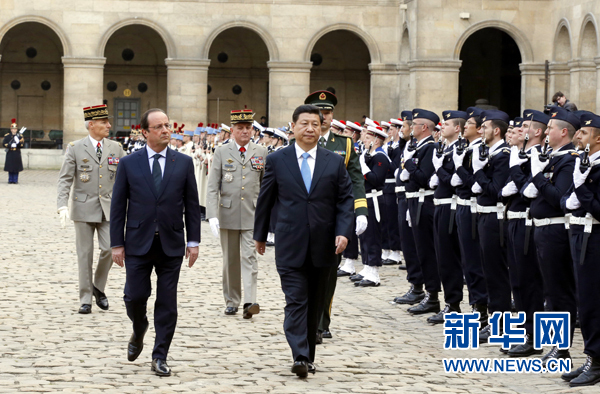 ??? 3月26日,國家主席習近平在巴黎同法國總統(tǒng)奧朗德舉行會談。會談前,奧朗德在榮軍院廣場為習近平舉行隆重歡迎儀式。 新華社記者鞠鵬攝