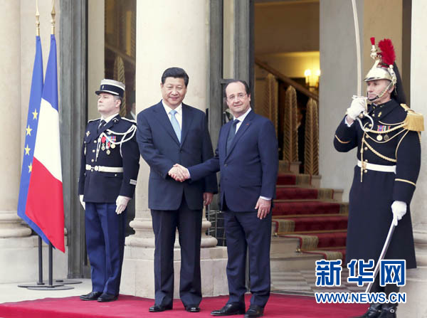????新華網(wǎng)巴黎3月26日電(記者陳贄 錢彤 劉華)國家主席習近平26日在巴黎同法國總統(tǒng)奧朗德舉行會談。兩國元首回顧中法建交50年的成就經(jīng)驗,規(guī)劃未來兩國關(guān)系發(fā)展,達成重要共識,決定站在新的歷史起點上,開創(chuàng)緊密持久的中法全面戰(zhàn)略伙伴關(guān)系新時代。習近平強調(diào),只要中法攜起手來,必將能夠在當前復(fù)雜多變的國際形勢下成就一番大事業(yè),開創(chuàng)新的光明前景。