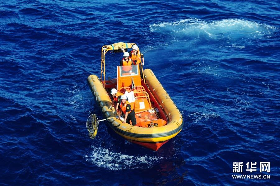 ????3月29日上午,在南印度洋,工作人員乘“海巡01”輪的船載小艇在疑似水域進行搜尋。