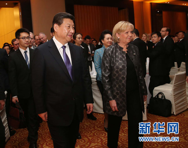 ??? 3月29日,國家主席習(xí)近平在杜塞爾多夫出席中德工商界舉行的招待會并發(fā)表題為《把握中國機(jī)遇,實(shí)現(xiàn)共同發(fā)展》的重要講話。這是習(xí)近平等步入招待會會場。新華社記者劉衛(wèi)兵攝