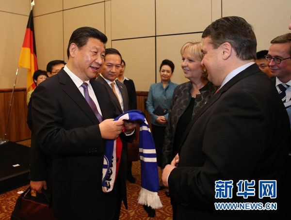 ??? 3月29日,中國國家主席習(xí)近平在杜塞爾多夫出席中德工商界舉行的招待會并發(fā)表題為《把握中國機(jī)遇,實(shí)現(xiàn)共同發(fā)展》的重要講話。這是招待會開始前,習(xí)近平在會見中德企業(yè)家代表時(shí),德國副總理兼經(jīng)濟(jì)和能源部長加布里爾(前右)向習(xí)近平贈送一家德國足球俱樂部球迷標(biāo)志性圍巾。新華社記者劉衛(wèi)兵攝