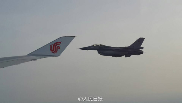 ????當(dāng)習(xí)近平乘坐的專機(jī)進(jìn)入比利時(shí)領(lǐng)空時(shí),比利時(shí)皇家空軍兩架戰(zhàn)機(jī)升空護(hù)航。(圖片來(lái)源:《人民日?qǐng)?bào)》法人微博)