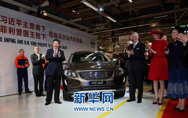 ????4月1日,國家主席習近平在比利時國王菲利普陪同下參觀沃爾沃汽車公司根特工廠。這這是習近平和菲利普國王共同為公司出口中國的第30萬輛汽車揭幕。 新華社記者 姚大偉 攝
