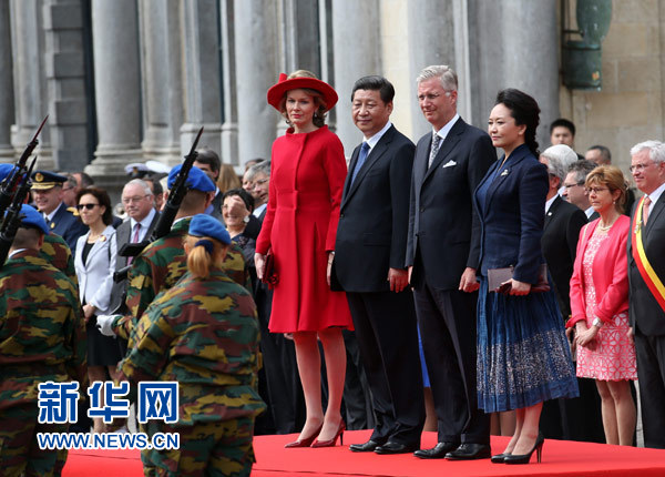 當(dāng)?shù)貢r(shí)間1日下午,習(xí)近平離開比利時(shí)布魯日市啟程回國(guó)。離開前,比利時(shí)國(guó)王菲利普在布魯日廣場(chǎng)為習(xí)近平舉行隆重歡送儀式。習(xí)近平和夫人彭麗媛,菲利普國(guó)王和瑪?shù)贍柕峦鹾笠煌饺霃V場(chǎng)。習(xí)近平在菲利普國(guó)王陪同下檢閱儀仗隊(duì)。軍樂隊(duì)奏中比兩國(guó)國(guó)歌,兩國(guó)元首共同檢閱儀仗隊(duì)分列式。
