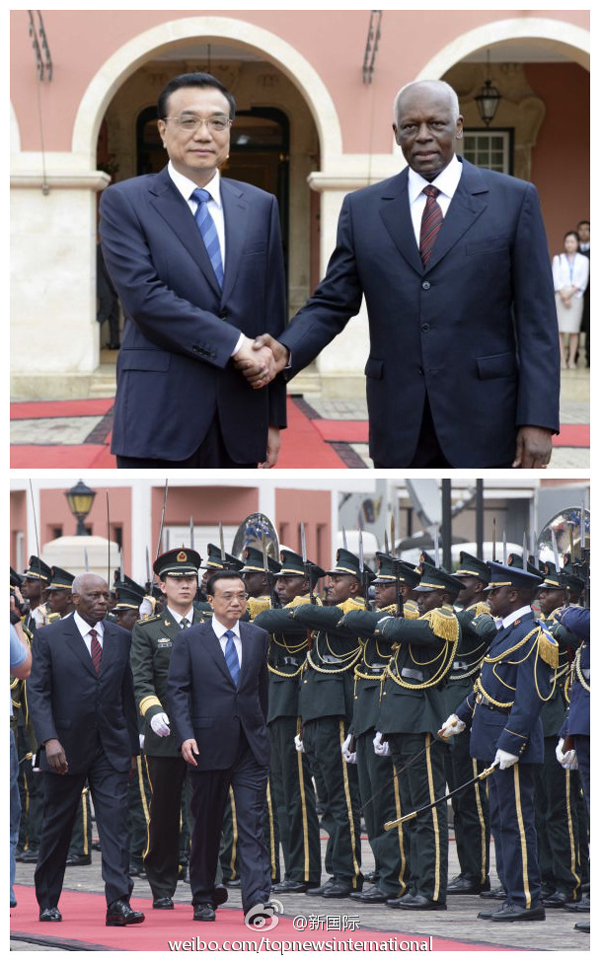 ????新華網(wǎng)北京5月9日電? 據(jù)新華社“新國際”微博報道,5月9日,國務(wù)院總理李克強在羅安達總統(tǒng)府出席安哥拉總統(tǒng)多斯桑托斯舉行的歡迎儀式。李克強總理在多斯桑托斯總統(tǒng)陪同下檢閱了儀仗隊。