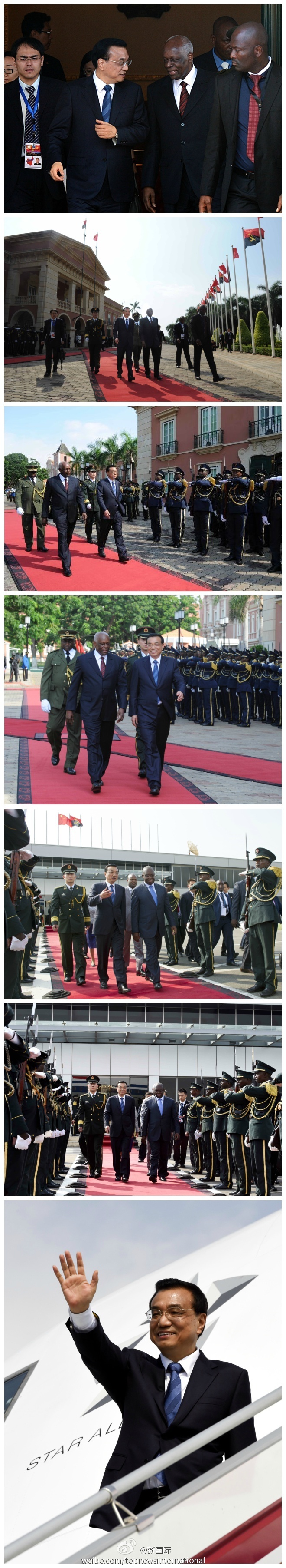 ????新華網(wǎng)北京5月10日電? 據(jù)新華社“新國際”微博報道,當(dāng)?shù)貢r間9日下午,李克強(qiáng)總理結(jié)束了在安哥拉的密集訪問行程,安總統(tǒng)多斯桑托斯夫婦在總統(tǒng)府為李克強(qiáng)夫婦舉行歡送儀式,安副總統(tǒng)維森特和外長希科蒂到機(jī)場為李克強(qiáng)夫婦送行。