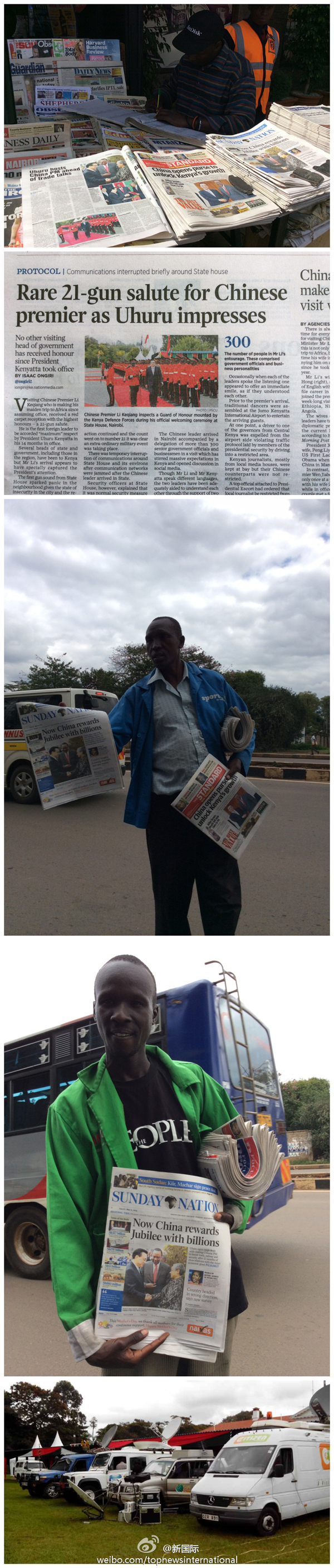 ????新華網(wǎng)北京5月11日電? 據(jù)新華社“新國際”微博報道,連日來,肯尼亞各大媒體紛紛對李克強總理訪肯進行全方位報道。主要報紙均在頭版頭條大篇幅介紹訪問情況,并開辟專版引述李總理講話對肯中關(guān)系進行述評。肯三大電視臺現(xiàn)場直播李總理和肯雅塔總統(tǒng)會見記者實況。肯媒體還高度評價中國在文化教育等領(lǐng)域的軟實力外交。